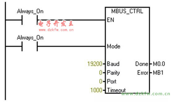Port :端口号设置,若使用PLC本体上的RS485端口,则应选择为0(注意S7-200PLC中的库指令中的MBUS_CTRL没有此管脚)