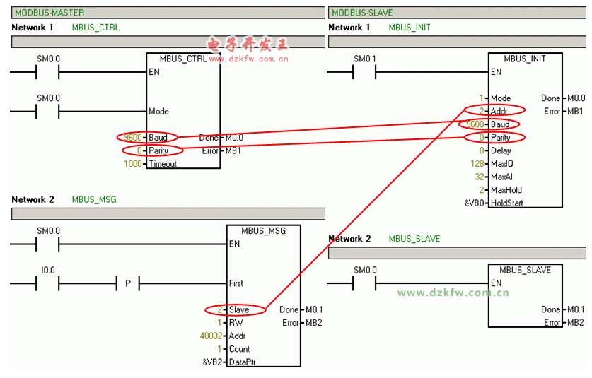 必须要保证主站与从站的“Baud”和“Parity”的参数设置要一致,并且程序块“MBUS_MSG”中的“Slave”地址要与程序块“MBUS_INIT”中的“Addr”所设置的一致 (见图。 02)。