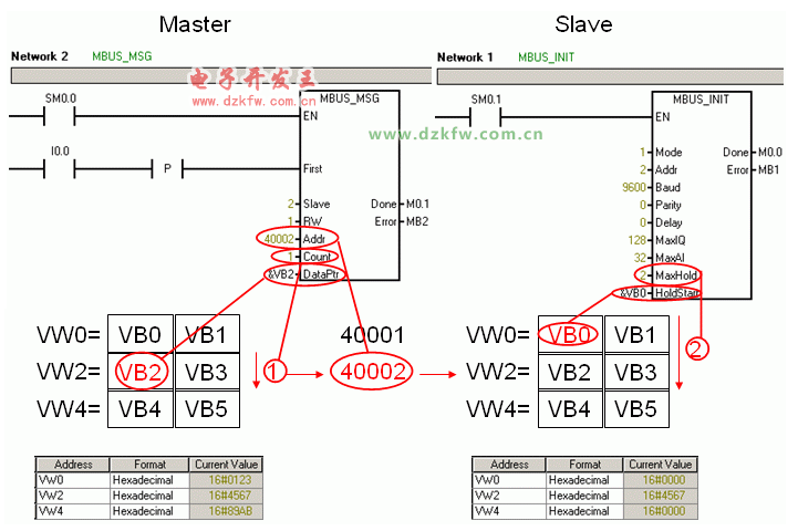 在 Micro/WIN 中您需要为主站和从站新建一个项目,程序与参数设置见图.02。
