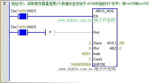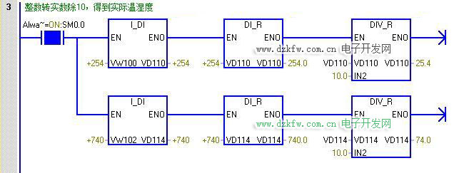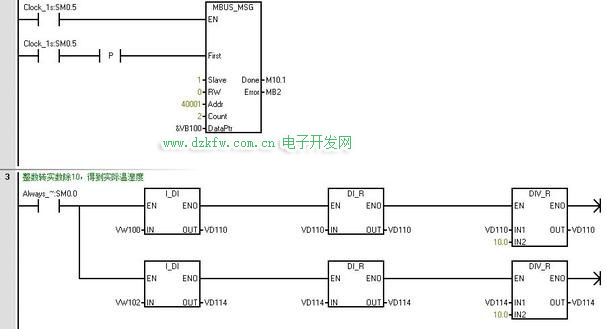 地址1的温湿度数据被存入到以VW100为起始的两个字,即vw100为温度,vw102为湿度,这里要注意,整数转为实数,最后在除以10,并是最后的温湿度值