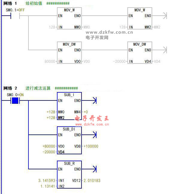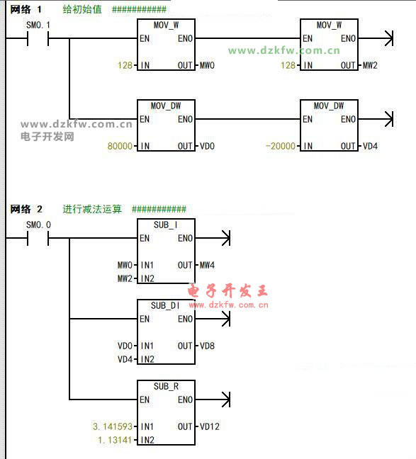 这是西门子200micro/win软件中我在主程序中简单写的一段程序,网络1利用SM0.1给MW0,MW2,VD0,VD4赋予了初始值。网络2就是做减法,SM0.0是一直接通的,所以这个减法就是一直在减。