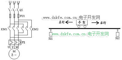 1)要实现小车的左右往复运动,只要对小车的拖动电动机实现正反转控制即可。这里用两个接触器分别控制小车左行(km2)右行(km1)。