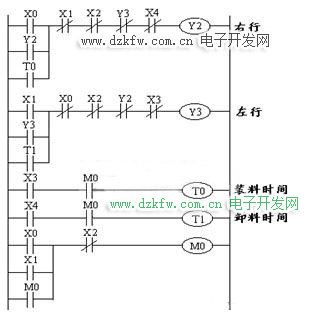 3)小车左行或第二次右行经过sq3时会使t1瞬间得电,非控制要求。