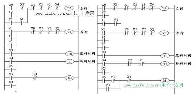 1)要实现两处卸料,重要的是判断小车右行时在sq3处是否需要停。可增加一个辅助继电器(m1)来记忆小车是否到过sq3(m1+),或sq2(m1—)。