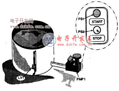 只要容器中有水(X002为ON ),而且标明为Stop的按粗PB2 (X001)没有按下,泵会一直工作:PMP1由输出Y000驱动。