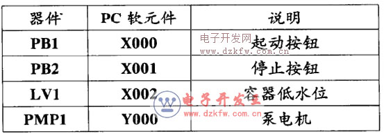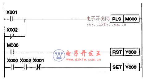 如果在泵工作期间的某一时刻,容器抽干了,即低水位检测器LV1被触发(X002会变为OFF ) ,泵会自动停止。实际上,低水位检测器提供可编程控制器常闭触点输入,也就是说,有水时,输入X002为ON,实际的低水位检测器为OFF。因此,若低水位检测器失效,即总是ON ( X002会变为OFF ) ,系统不允许泵工作,故在故障时是安全的。