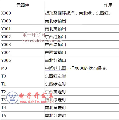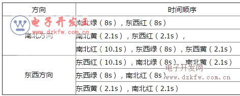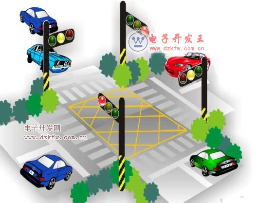十字路口南北及东西方向均设有红、黄、绿三个信号灯,六个灯以一定的时间顺序循环往复工作。