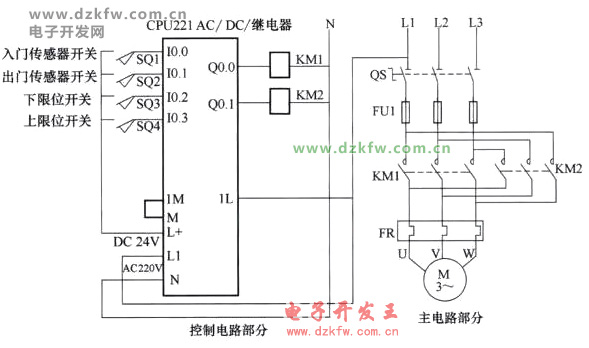 在车辆出库经过出门传感器时,出门传感器开关闭合,车库门电动机正转,车库门上升,当门上升到上限位开关处时,电动机停转;车辆出库经过入门传感器时,入门传感器开关闭合,车库门电动机反转,车库门下降,当门下降到下限位开关处时,电动机停转。