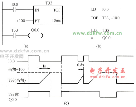 简介断开延时定时器指令用于断开后的单一间隔定时,该指令的梯形图和语句表如图 3 - 44 所示, TOF 为定时器标识符, Tn 为定时器编号, IN 为启动电平输入端, PT 为时间设定值输入端。当