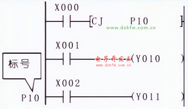 当X0为ON时,被跳转CJ命令到标号之间的程序不子执行。在跳转过程中如果Y、M,S被OUT、SET. RST指令驱动使输入发生变化则仍保持跳转前的状态。例如,通过X1驱动输出Y10后发生跳转,在跳转过程中即使X0变为ON,但输出Y10仍有效。