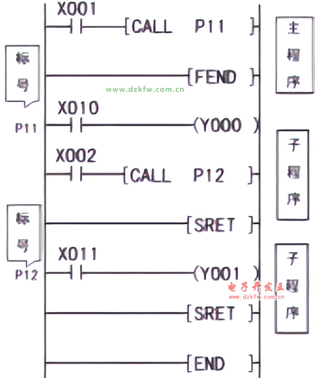 图中FEND表示主程序结束,在FEND前面的我们称为主程序,在FEND后面的我们称为子程序。SRET表示子程序结束,或者叫子程序返回。我们要注意,在FEND与SRET之间的程序,我们称为第一个子程序,在第二个SRET之前的我们称为第二个子程序。当我们按下X001的时候,指针调用到P11,程序开始从P11这个地方从上往下开始执行,当碰到第一个SRET的时候,程序又返回到主程序中,但是在这个程序中如果X002被接通,那么程序指针则调用到P12,程序开始从上到下运行,当碰到第二个SRET的时候,程序返回到P12这个地方,然后在碰到第一个SRET的时候,返回到主程序。因为P12这个程序是嵌套在P11这个程序中的,所以我们要注意,在PLC中这种程序嵌套最多只能使用5级。
