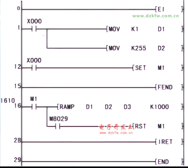 当我们按下X000后K1的数据被传送到D1里面去,K255的数据被传送D2里面去,M1被置位接通,中断子程序运行。RAMP 表示斜坡指令,表示产生一个数据D3,而D3的变化范围是从D1到D2也就是从1到255,由于这是一个定时中断程序,当M1接通的时候,每隔10ms中断一次程序,K1000表示1000个扫描周期,因为D3的范围是从1变到255,而它所需要的时间为1000个10ms,也就是说从X0接通到D3变成255的时间为1000X10ms=10秒,当D3等于255的时候M8029接通,M1被复位断开,然后中断指令与斜坡指令被断开,然后碰到IRET指令程序返回。