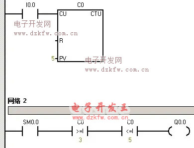 输入信号I0.0,输出信号Q0.0 ,实现功能按钮计数控制,按三次亮,再按两次灭。通过计数器、数值比较实现的功能。如下图所示梯形图实例: