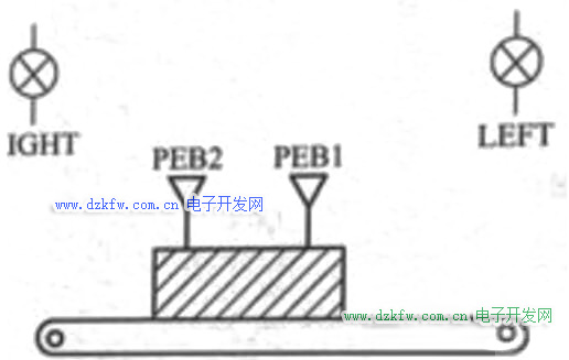 一侧装配有两个反射式光电传感器PEB1和PEB2(安装距离小于包裹的长度),设计用于检测包裹在传送带上的移动方向,并用方向指示灯left和right指示。