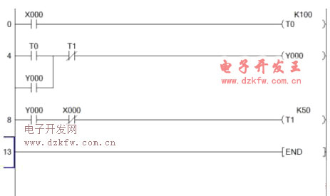 设计一个通电和断电均延时的梯形图,要求:当X000由断变通时,延时10S后Y0得电;当X000由通变断时,延时5S后Y000断电。