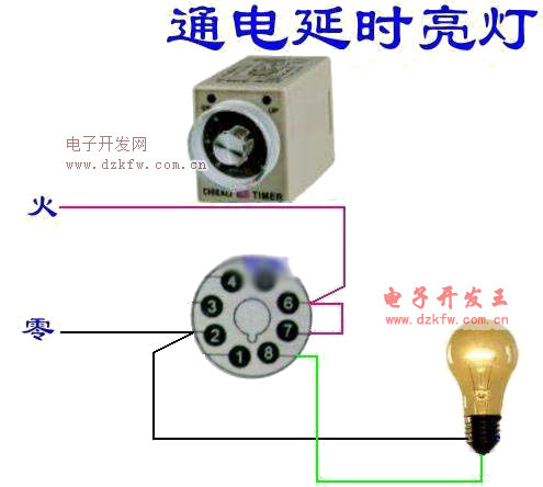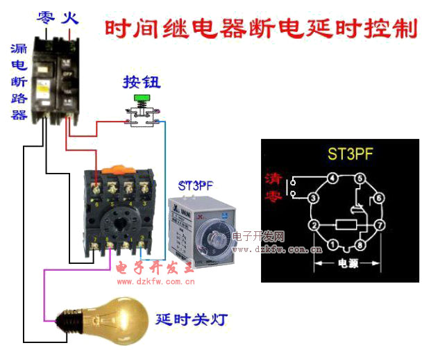 有关时间继电器断电延时控制的接线图,包括漏电断路器、零线与火线接法,使用时间继电器实现延时关灯的功能。
