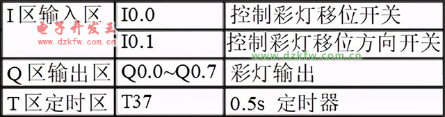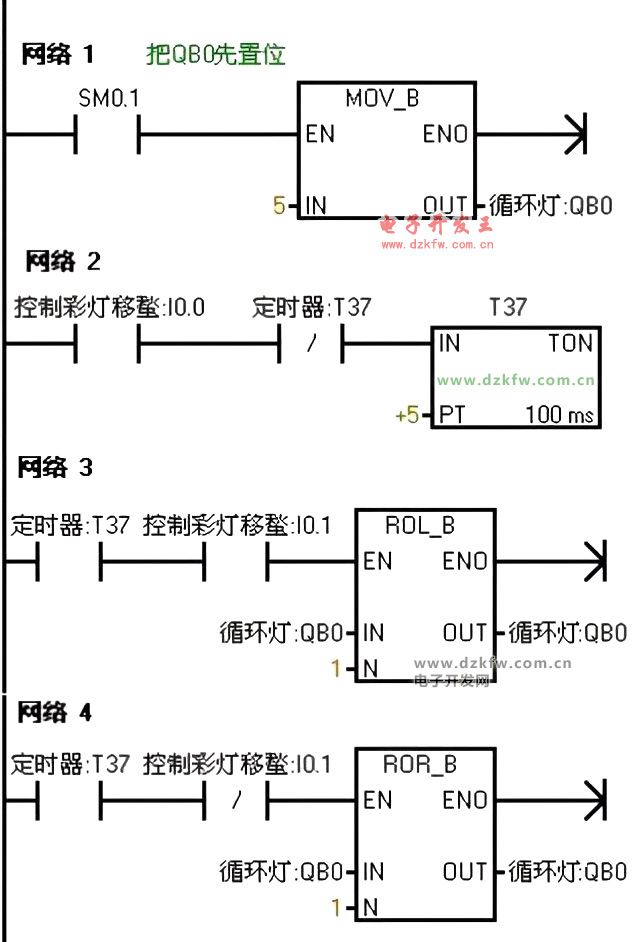 学习西门子plc编程的入门例子,实现8个彩灯移位控制,用IO导线控制接在Q0.0到Q0.7上的八个彩灯循环移位,用t37定时,每0.5S移位一位,首次扫描时给Q0.0到Q0.7置初值,让Q0.0和Q0.2先有输出,用I0.1来控制彩灯位移的方向。