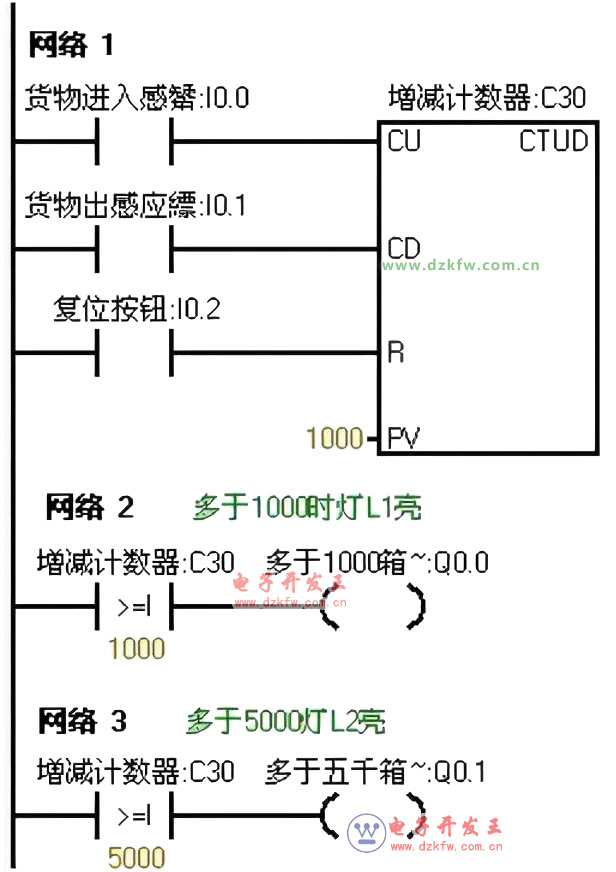 学习西门子plc编程的入门例子,西门子plc比较指令的用法,对进出仓库的货物进行记录,仓库最多可放6000箱货物,当货物多于1000箱灯L1亮,多于5000箱时灯L2亮。