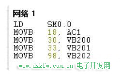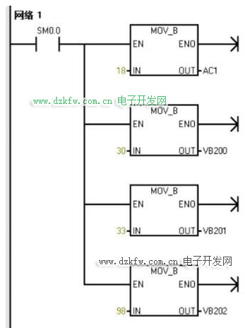已知VB10=18,VB20=30,VB21=33,VB32=98。将VB10,VB30,VB31,VB32中的数据分别送到AC1,VB200,VB201,VB202中。写出梯形图及语句表程序。