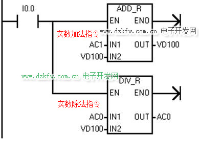 实数运算指令的应用的指令表及梯形图,程序如图所示。