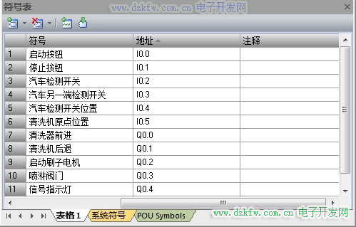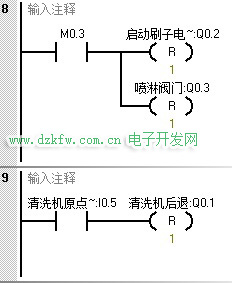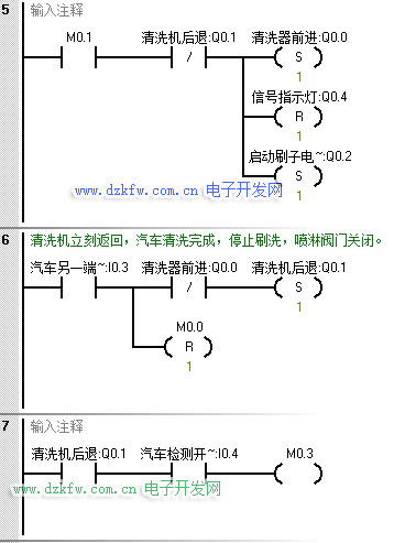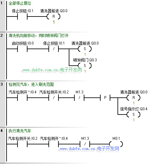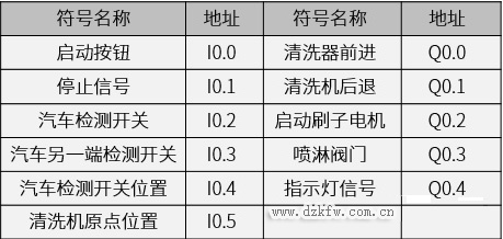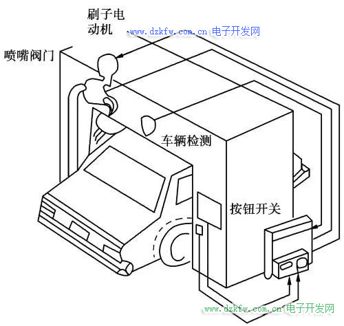 先工作人员按下开启按钮,清洗机向前移动并同时打开喷淋阀门。当移动到汽车检测位置时,如果汽车检测开关没有检测到汽车,清洗机就暂时停止移动,并等待汽车进入到刷洗位置后,清洗机继续向前移动,同时启动刷子对汽车进行清洗。如果清洗机移动到汽车的另一端时,清洗机就立即返回,当返回到汽车检测位置时,汽车清洗完成,然后停止刷洗,喷淋阀门关闭。汽车离开,清洗机返回原点后停止工作。