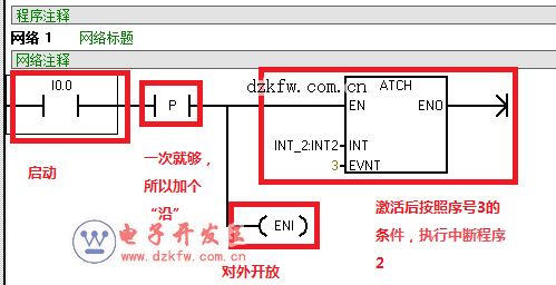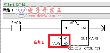在明确了中断程序2的执行条件是“I0.1的下降沿”的情况下,在编辑程序时可以把原本计划添加的触发条件省略掉。直接使用SM0.0,如下图: