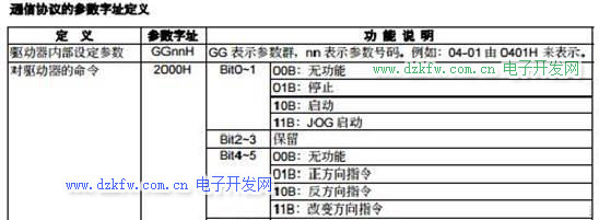 根据下图台达变频器通讯协议的参数,向台达变频器2000h地址写数据01(XX000001)时停止运行,写12H(XX010010)是正转,写22H (XX100010)是反转。