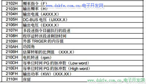 根据台达变频器通讯协议向变频器2103H地址发送03命令可以查询输出频率,向变频器2104H地址发送03命令可以查询输出电流,向变频器2106H地址发送03命令可以查询输出电压,向变频器210FH地址发送03命令可以查询输出功率,见下表。