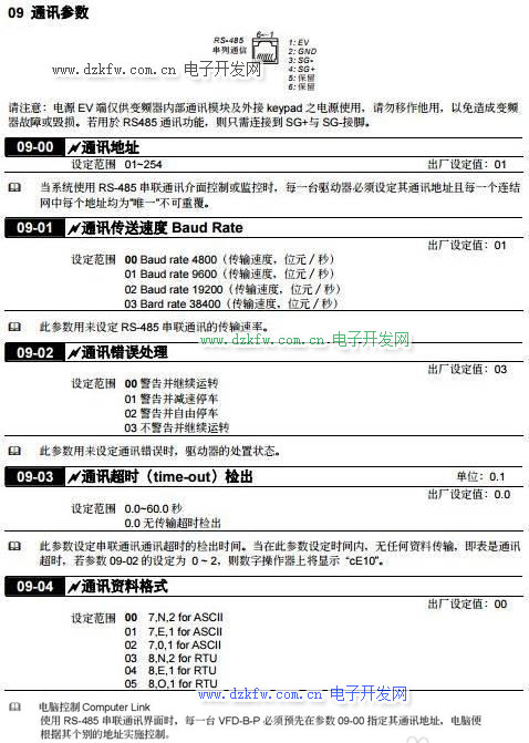 通讯参数出厂设定值如下图所示。所以在使用PLC控制变频器之前需要对变频器进行必要的设置,如波特率,地址,通讯格式等等。