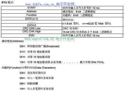 通讯协议:台达变频器支持Modbus RTU模式和ASCII码模式,我们用RTU模式,通讯协议如下图:例如要查询地址是01的2102H的数据,需要发送0103210200028FF7,返回01030417700000FE5CH,其中01是地址,03是查询命令,417700000F是返回的数据8FF7是校验码。如果要向变频器写数据需要发送06命令,例如发送0106010017708622,向01号变频器的0100地址写数据1770,如果操作成功,返回0106010017708622。