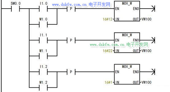 下面程序是通过按钮(I0.0—I0.2)控制变频器正转,反转和停机。修改变频器运转命令,M1.0正转,M1.1反转,M1.2,向变频器2000h单元值写入1是停止,12是正转,22是反转,1是停机。