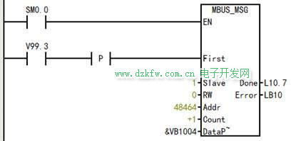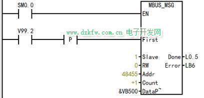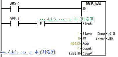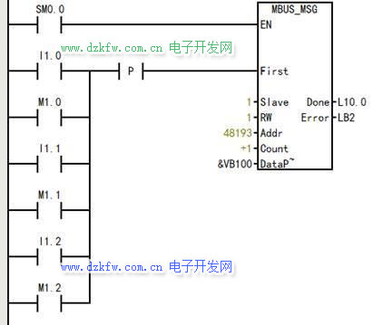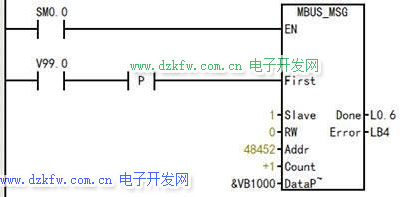 以下为读变频器参数,读变频器2103H是获取输出频率,读2104H是获取输出电流,2106h输出电压,2103h=8451,8451+40001=48452是向2103H读数据,即读频率值,读出的频率值送变量存储器VB1000单元中。