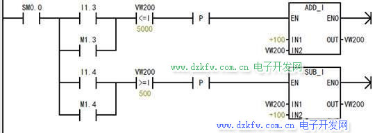 下面程序是按下加速按钮(I0.3)vw200单元数值增加100,按下减速按钮(I0.4)VW200单元数值减100.