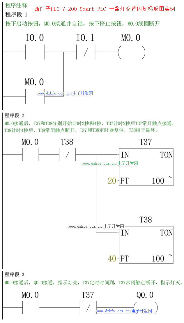 M0.0接通后,Q0.0接通,指示灯亮,T37定时时间到,T37常 闭触点断开,指示灯灭。