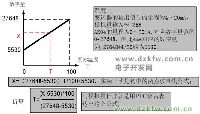 温度变送器的输出信号的量程为4~20mA,模拟量输入模块EM AE04的量程为0~20mA,二者不完全对应,因此实际物理量0℃对应模拟量模块内部数字量5530,实际物理量100℃对应模拟量模块内部数字量27648。