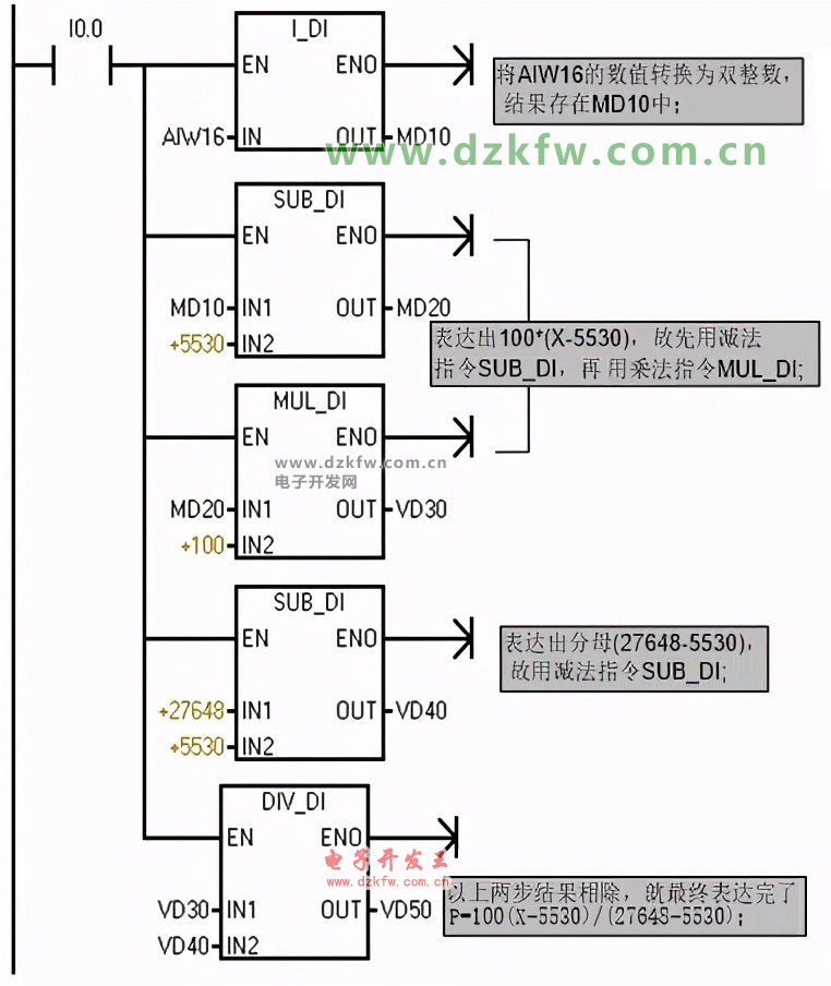 通过上步找到比例关系后,可以进行模拟量程序的编写了,编写的关键在于用PLC指令表达出P=100(X-5530)/(27648-5530)。