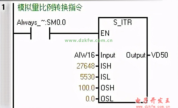 利用库文件中的模拟量比例转换指令S_ITR,可以非常方便的将实际物理量与模拟量输入模块内部数字量建立联系。