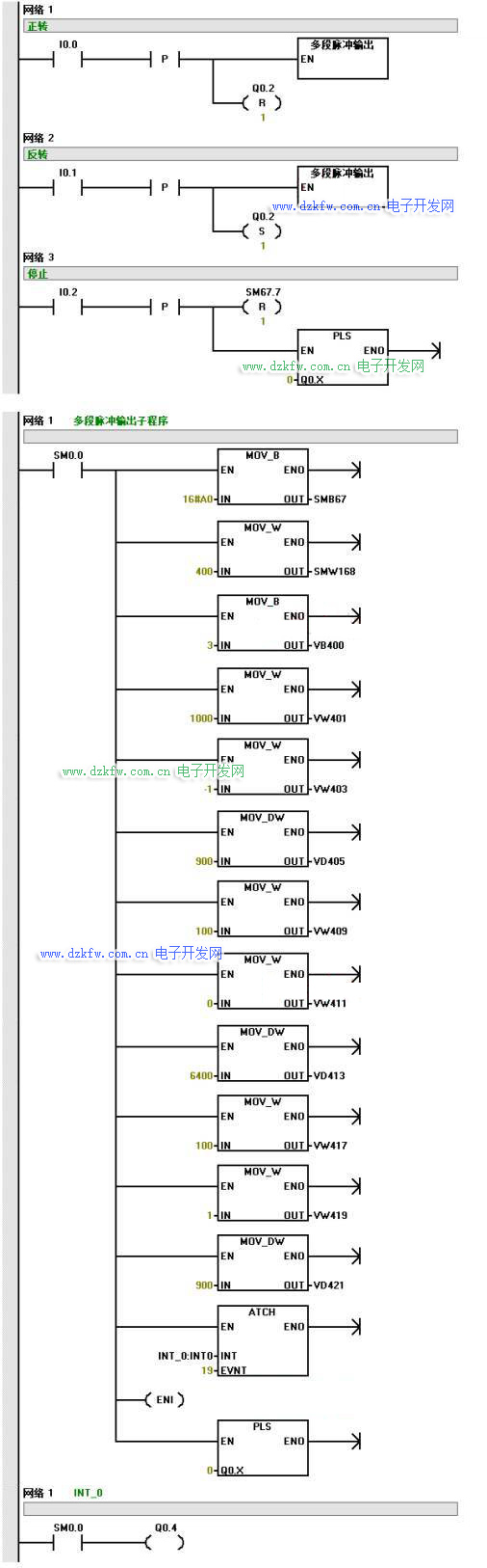 (5)建立中断连接:用ATCH指令建立脉冲输出完成中断事件与中断程序的联系,用ENI全局开放中断;当PLS指令输出完指定数量的脉冲串时,产生中断。