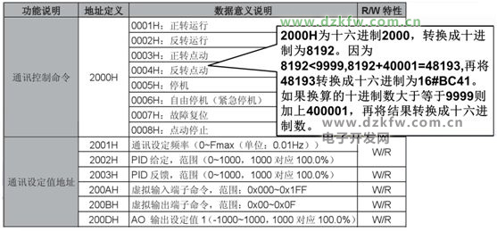 分析:想要通过通信控制启停和频率,必须将运行指令通道设置成通信给定P00.01=2,频率指令选择设置成MODBUS通信设定P00.06=8。有关通信组的参数采用默认值,本机通信地址P14.00=1,通信波特率P14.01=4(19200bps),数据位校验格式P14.02=1(偶检验E,8,1 for RTU)。