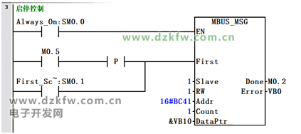 SMART中保持性寄存器的modbus地址为40001-49999,400001-499999。查阅英威腾手册得知通信地址如图1-3所示,算出控制启停的通信地址为16#BC41,程序如图1-4所示。