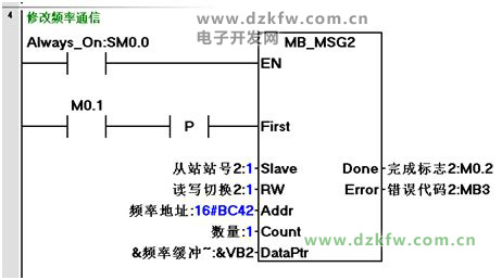 3.编写修改频率的程序。同样的方法换算出控制频率的通信地址为16#BC42,程序如图1-5所示。