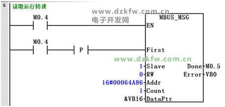 5.编写读取运行转速程序,同理得出运行转速地址为16#64A86,程序如图1-8所示。