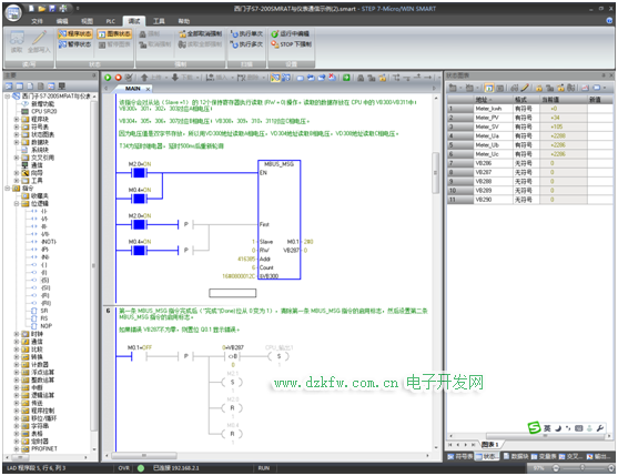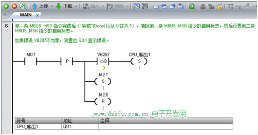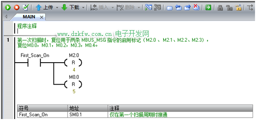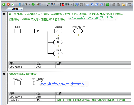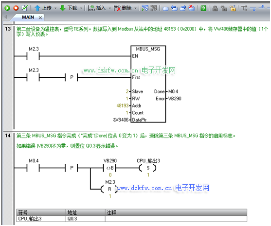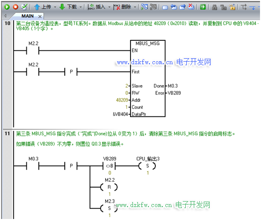 (11)程序10-11:轮询读第二台设备,读从机地址2的温控表测量值参数。 MBUS_MSG 指令完成("完成"(Done) 位从 0 变为 1)后,清除 MBUS_MSG 指令的启用标志。