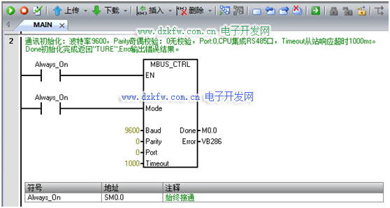 (5)编制第一、二段:置位标志位及通讯初始化:波特率Baud=9600,Parity=0无校验,Port=0集成CPU内RS485口,Timeout从站响应超时50ms。Done初始化完成返回"TURE",Error输出错误结果。