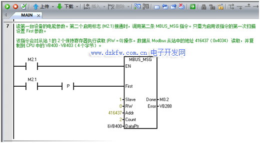 (9)程序7:第二次轮询,读电能值参数:读第一台设备的频率参数。第二个启用标志 (M2.1) 接通时,调用第二条 MBUS_MSG 指令。只需为启用该指令的第一次扫描设置 First 参数。该指令会对从站 1 的 2 个保持寄存器执行读取 (RW = 0) 操作。数据从 Modbus 从站中的地址 416437(0x4034)读取,并复制到 CPU 中的 VB400 - VB403(4 个字节VD400)。