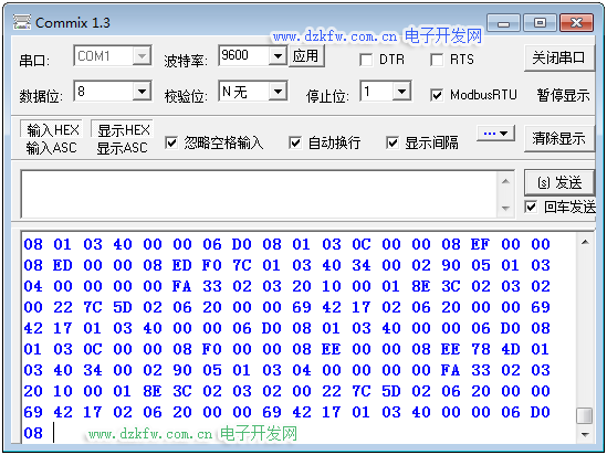 六、串口监控:在电脑上用USB转RS485转换器连接到RS485接线端上,监控PLC与仪表的通信收发报文: