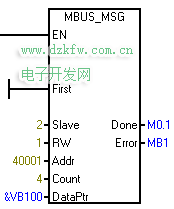 (2)MBUS_MSG指令(或用于端口1的MBUS_MSG_P1)用于启动对Modbus从站的请求,并处理应答。当EN输入和“首次”输入打开时,MBUS_MSG指令启动对Modbus从站的请求。发送请求、等待应答、并处理应答。EN输入必须打开,以启用请求的发送,并保持打开,直到“完成”位被置位。