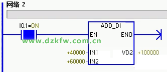 因为上面的加指令输入的2个值,与输出的结构,都没有超过“字”的计数范围的上限32767,所以可以使用ADD_I。当输入值中有超过32767,或运算结果超过这个值时,指令应换成ADD_DI,避免产生数据溢出的情况。