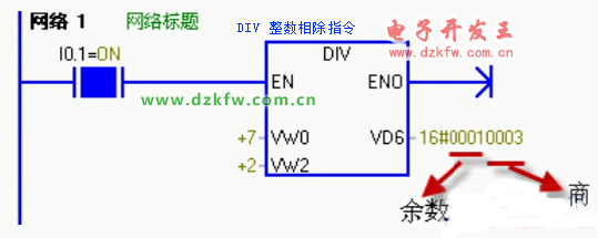 当条件I0.1接通时,执行指令,执行时VW0的数据/VW2的数据,其运算结果存到VD6中。其中VW6存放余数,VW8放商。