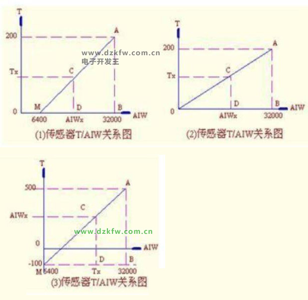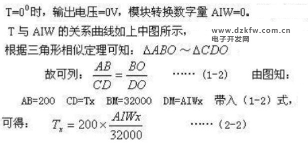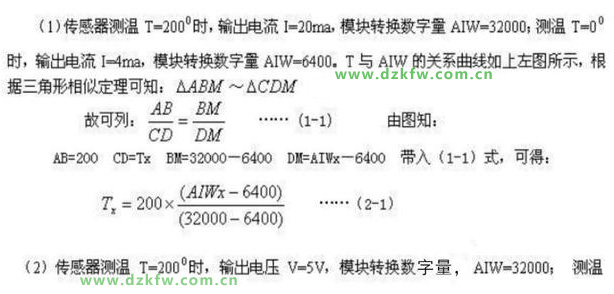 上面推导出的( 2-1)、( 2-2)、( 2-3)三式就是对应( 1)、( 2)、( 3)三种温度传感变送器经过模块转换成数字量后再换算为被测量的转换公式。 编程者依据正确的转换公式进行编程,就会获得满意的效果。